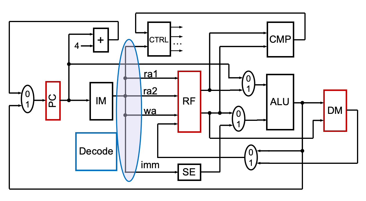 依据简化的单周期数据通路,实现对 RV32I 大部分指令的支持。