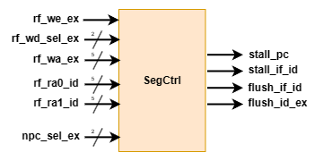在本次实验中,所有的控制冒险以及 Load-Use 冒险 均在 ID - EX 段进行判断。如果 EX 段为 load 指令且与 ID 段的指令数据相关;或 EX 段为需要跳转的指令,则需要产生相应的段间寄存器控制信号。该模块的示意图如下: