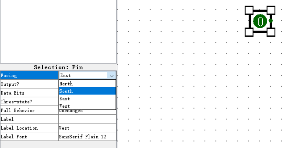 那么如何画一个竖着的非门呢?首先,我们需要调整器件的方向。在编辑模式下点击输入引脚,在左侧的属性表中将 Facing 属性改为 South。此时输入端口就朝向了下方。