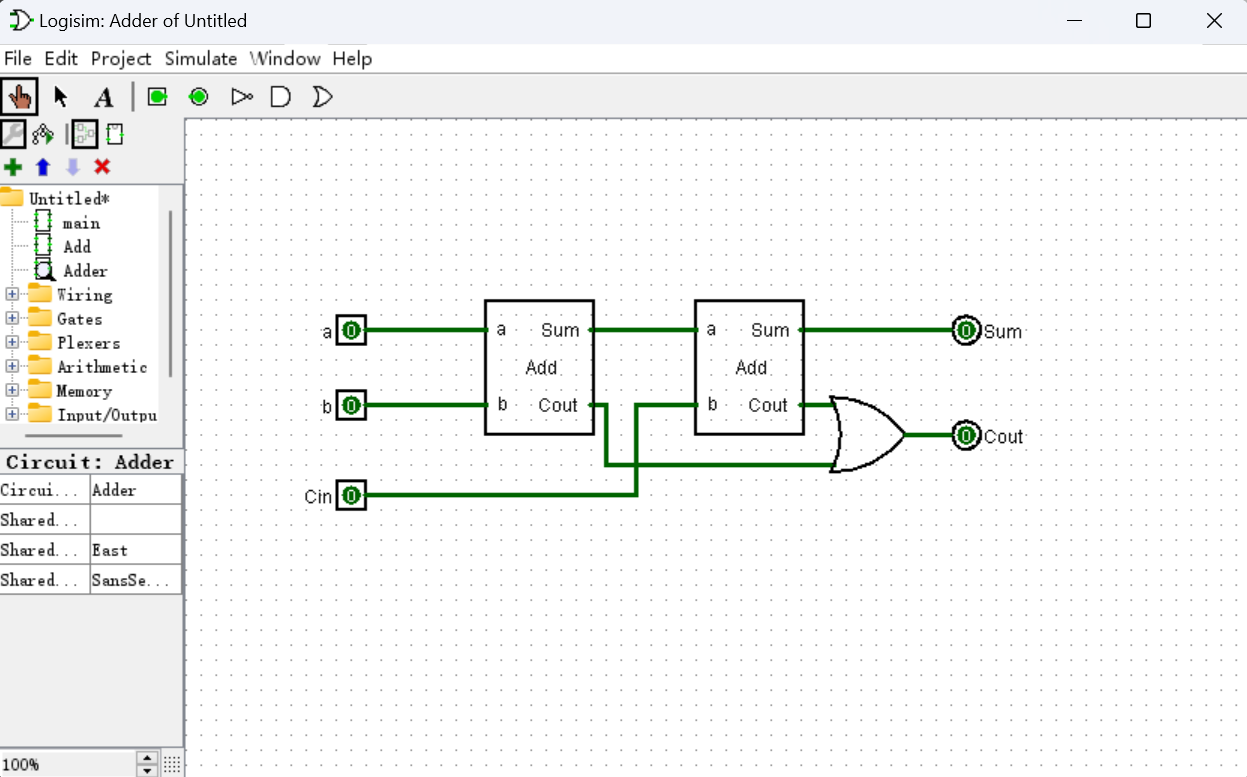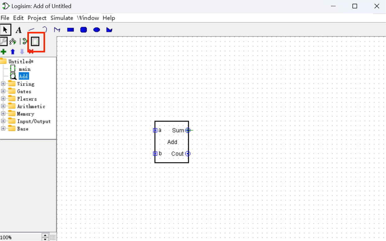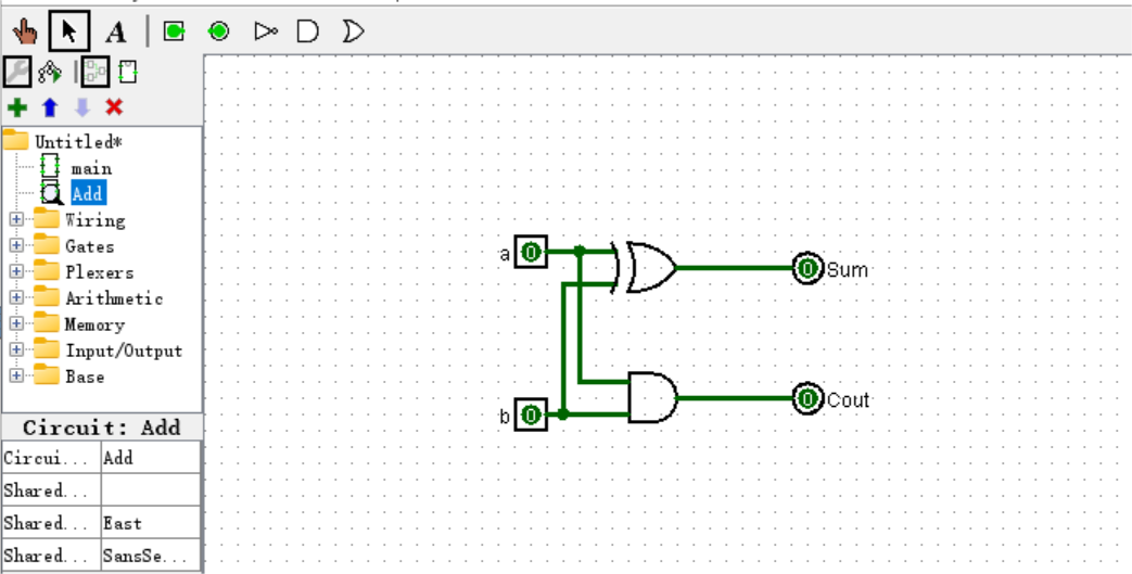 在 Logisim 中,新建一个新的电路文件命名为 Add,并绘制电路结构,参考下图完成一位半加器的设计。