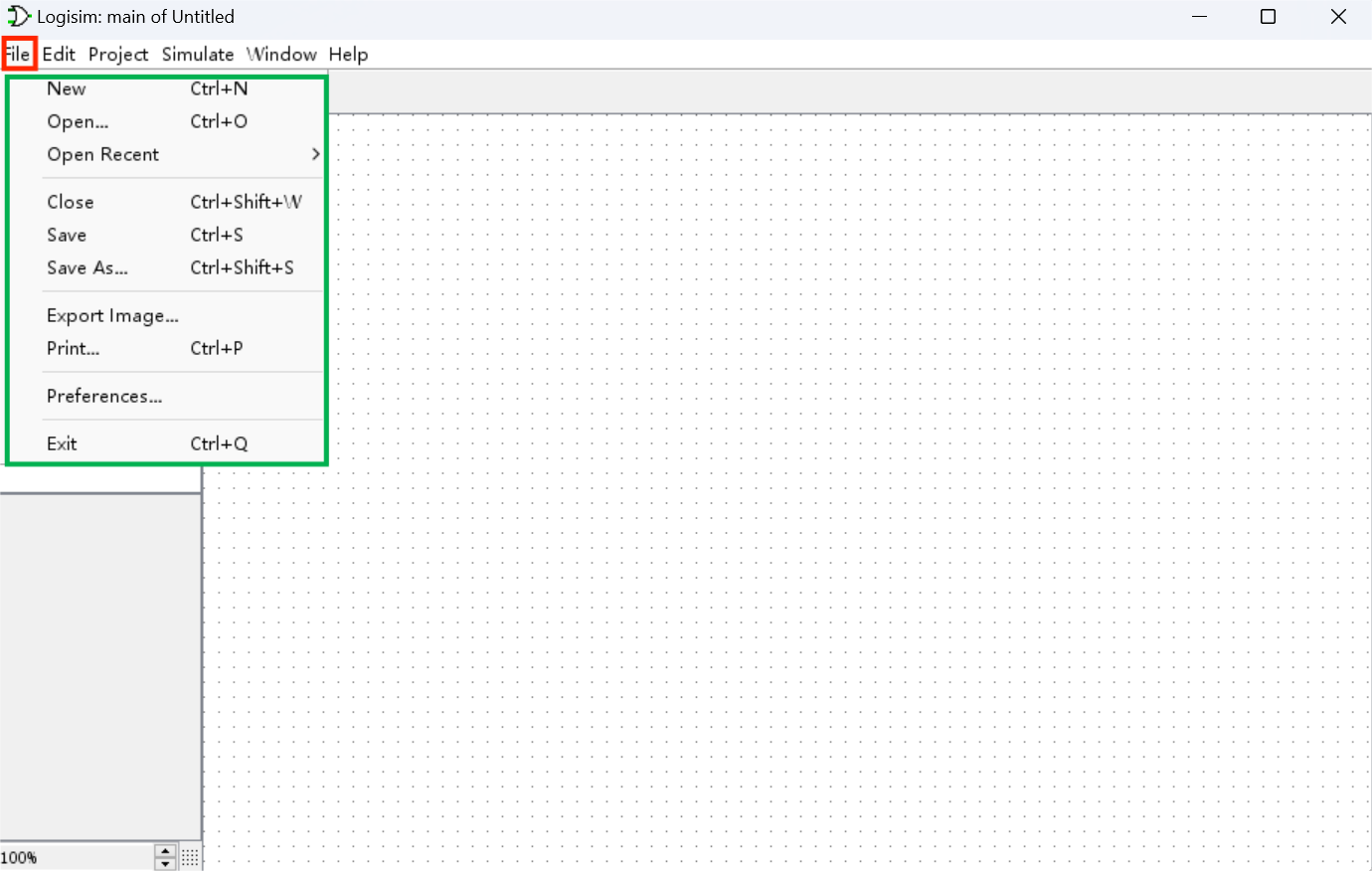 安装完毕后,便可双击 Logisim 可执行文件启动 Logisim 工具。你将看到下图所示的主界面: