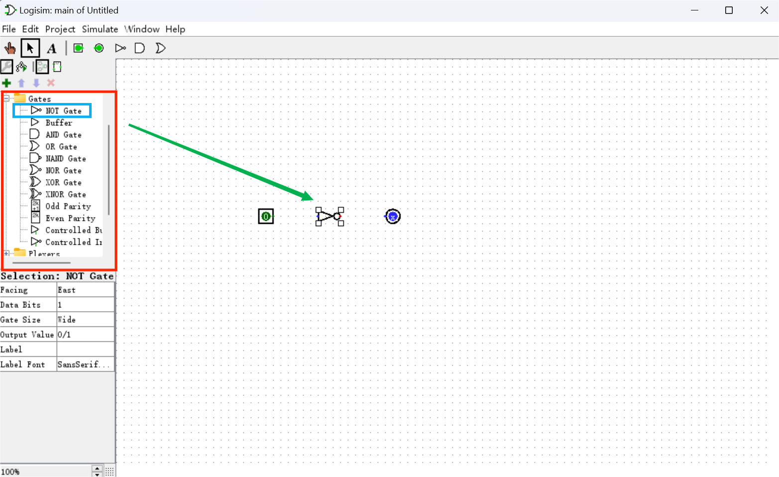 为了得到我们想要的非门,我们可以使用 Logisim 提供的非门组件。如图所示,在管理窗格的 Gates 文件夹下选中 NOT Gate,通过与输入输出引脚相同的操作插入到窗口中。这样,一个最简单的非门就搭建好了!