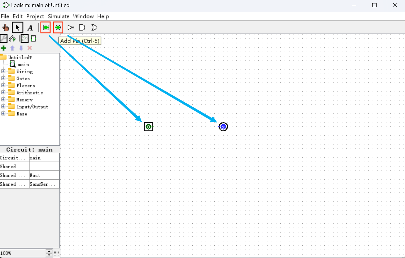 接下来我们将尝试绘制一个基本的非门电路。首先,单击工具栏中的输入引脚, 移动(不是拖动)鼠标到窗口界面中,再次单击将其放下。输出引脚的操作同理。
