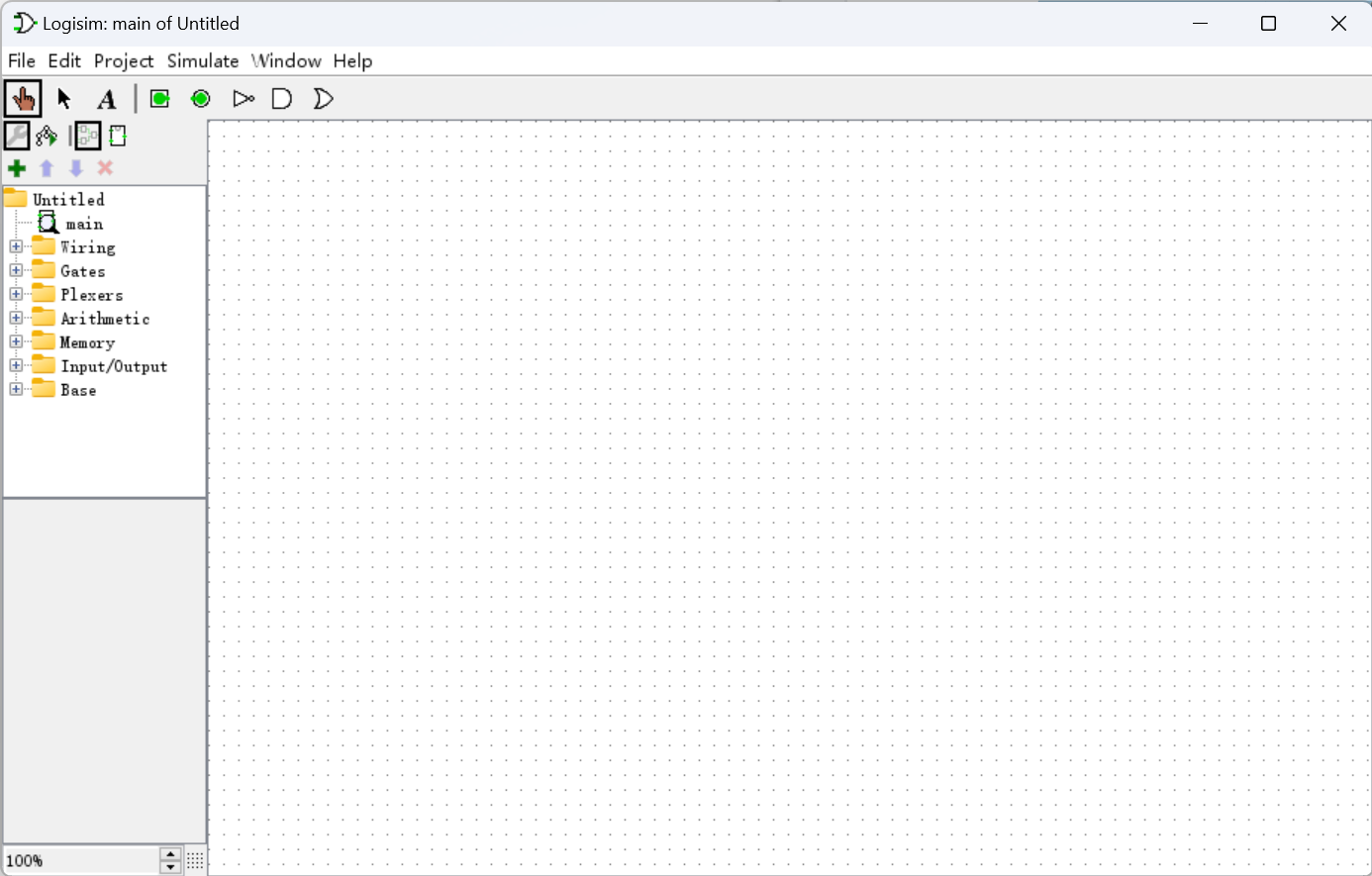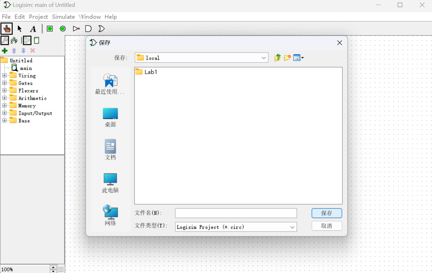 在打开 Logisim 后,程序会默认创建新电路窗口,我们便可以在这里进行电路图的绘制。任何时候按下 Ctrl+S 即可快速保存当前电路图(文件扩展名为 .circ)。