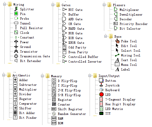 此外,Logisim 所支持的组件都可以在管理窗内的各个文件夹里面找到。每个组件都有其对应的参数,用户可根据需要进行修改。