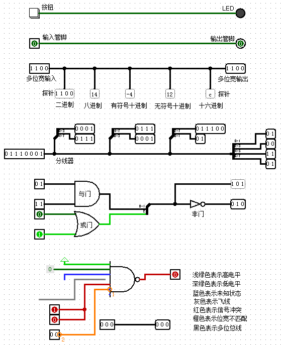 除了基础的非门电路,大家可以自行了解:按钮、LED、输入管脚、输出管脚、多位宽信号、探针、分线器、基本逻辑门等各类组件的作用与使用效果,以及不同颜色的线缆所代表的含义。
