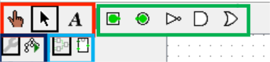 绿色框中为几种常用基本电路组件的快捷方式,从左到右分别为输入引脚、输出引脚、非门、与门和或门。这几种组件也可以在管理窗口内找到。
