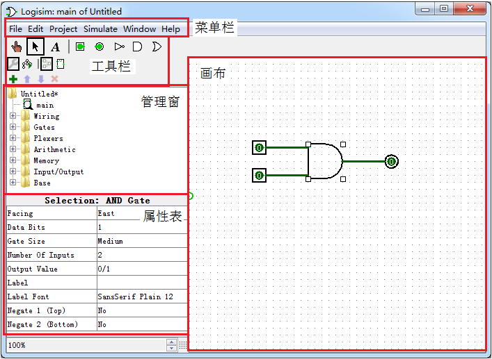 Logisim 主界面包括 5 大部分:菜单栏、工具栏、管理窗、属性表以及画布。
