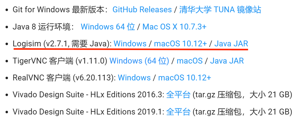 如果想在自己的电脑上搭建 Logisim 实验环境,可在 Vlab 平台下载与用户操作系统相匹配的 jre 软件和 Logisim。步骤如下:进入 Vlab 首页,依次点击使用文档 \(\rightarrow\) 资源下载即可进入如图所示的下载界面。也可以直接点击链接跳转。