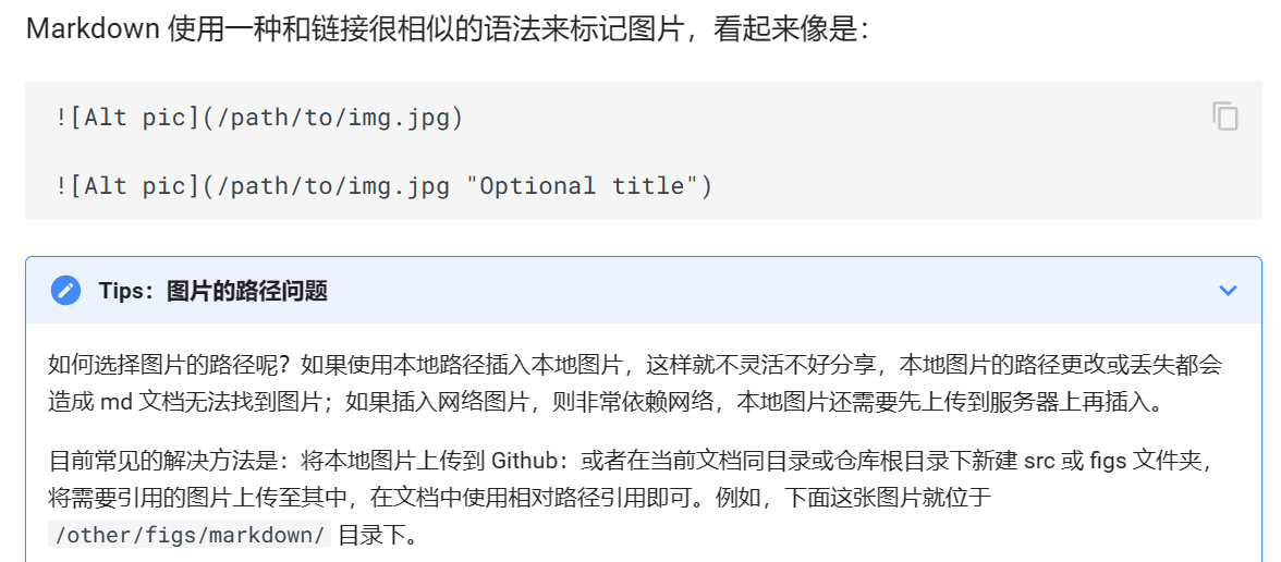 如何选择图片的路径呢?如果使用本地路径插入本地图片,这样就不灵活不好分享,本地图片的路径更改或丢失都会造成 md 文档无法找到图片;如果插入网络图片,则非常依赖网络,本地图片还需要先上传到服务器上再插入。