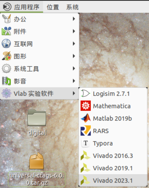 选好镜像后,等待一段时间即可完成虚拟机的创建工作。现在,虚拟机上已经配置好了完整的实验环境。使用远程桌面登陆后,即可在左上角的应用程序\(\rightarrow\)Vlab 实验软件目录中找到我们需要的实验资源。