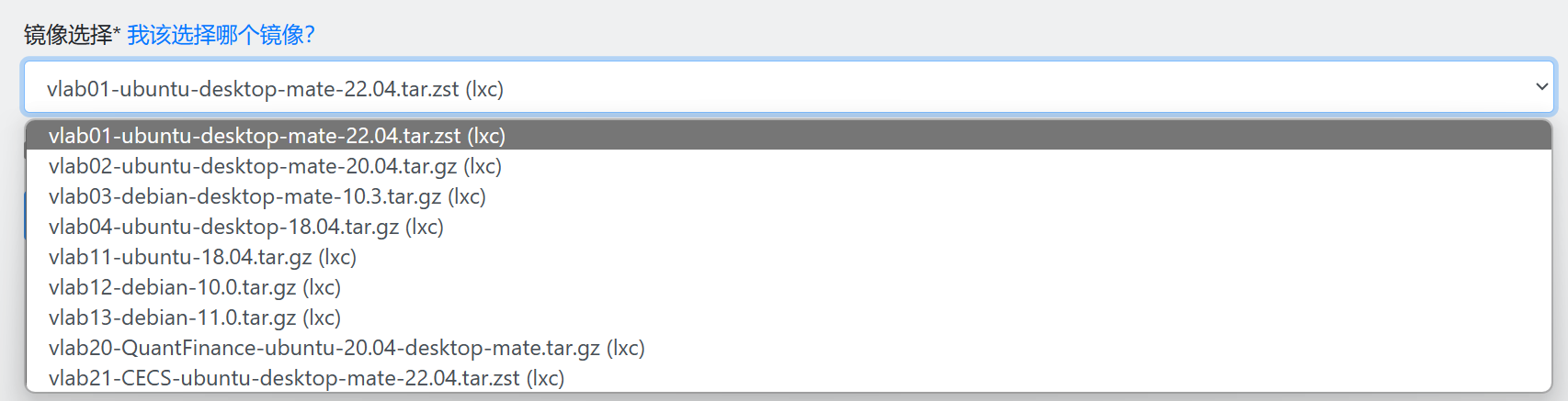 镜像可以简单理解为虚拟机的模板,内部包含了完整的操作系统及配套软件。不同的镜像包含的不同的操作系统配置(例如 Ubuntu、Debian 或者 CentOS),在使用过程中也会有一些不同。在这里,我们选择 vlab01 的虚拟机镜像即可。该镜像供了计算机系实验所需要的必备软件(如 Xilinx Vivado),可以为我们省去自己安装与配置这些软件的负担。此外,这些软件不会占用自己的虚拟机存储空间,而是被存储在实验平台的一个特定容器中。