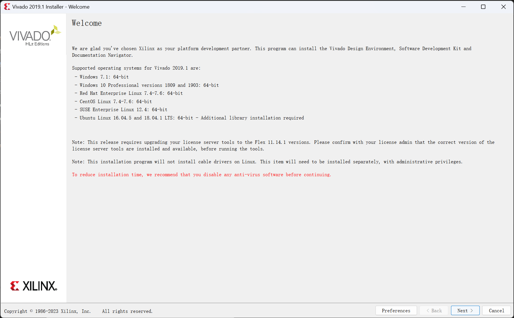 首先进入下图所示的界面。这里简单介绍了 2023.1 版本的 vivado 所支持的操作系统版本。单击 Next