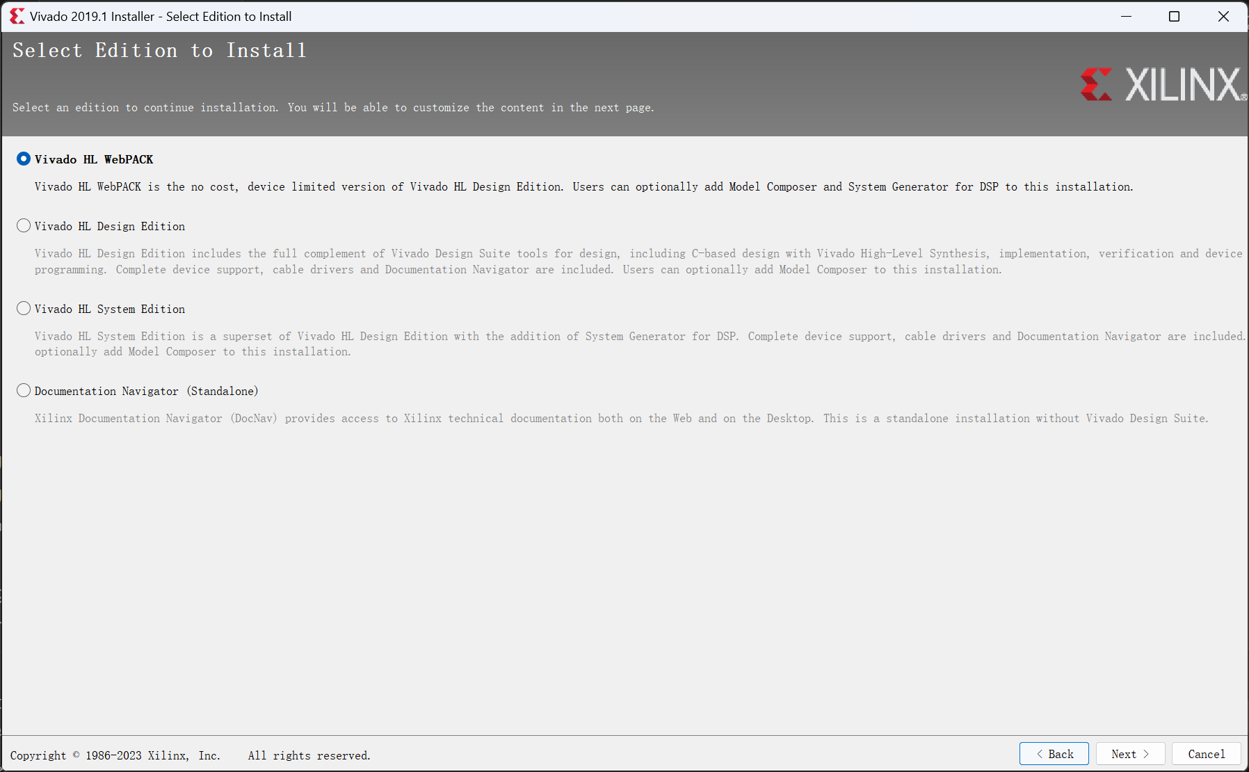 进入安装版本选择界面。选择最上面的 Vivado HL Webpack 版本,单击 Next