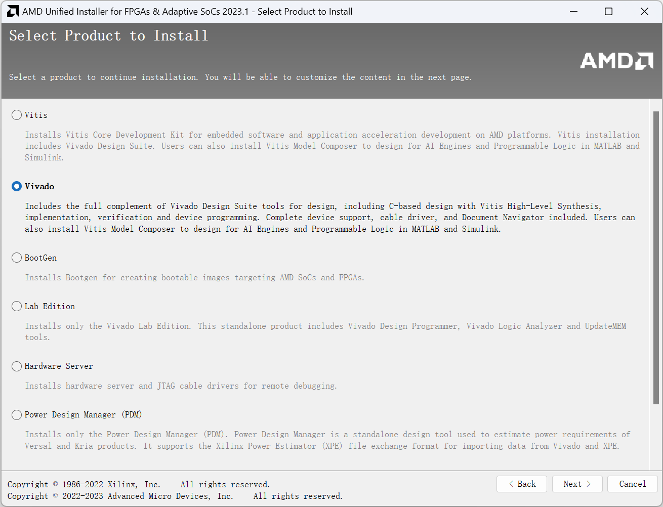 接下来是产品界面。单击选择 Vivado,再单击 Next