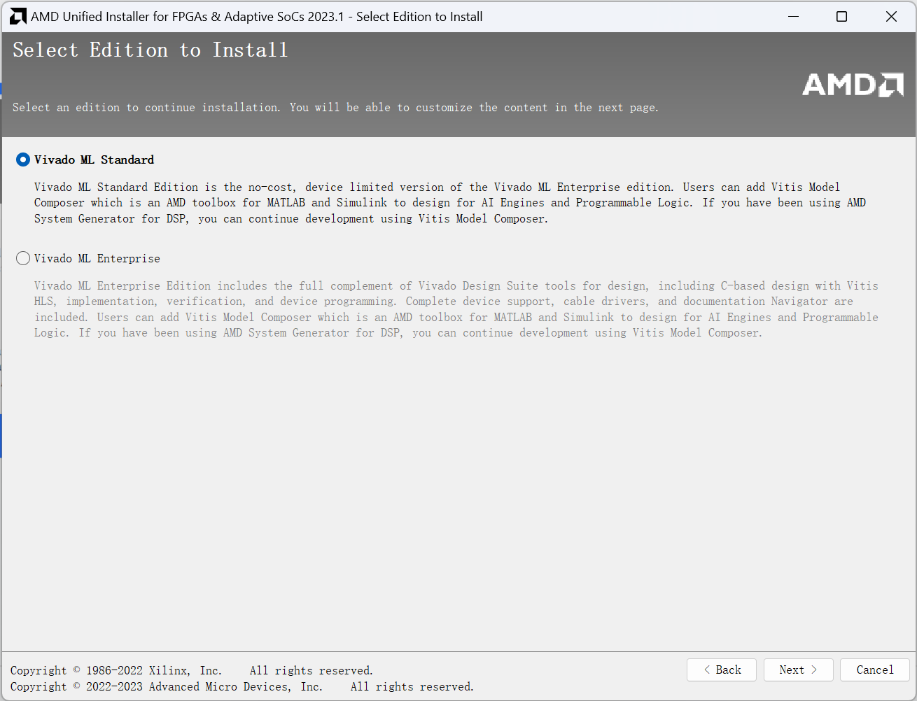 选择安装 Vivado 后,下面会选择安装标准版本(Standard)或者是企业版本(Enterprise)。二者的区别在于企业版本的 Vivado 额外支持高性能的芯片,比如 KU+15P。这里我们选择标准版(Standard)安装即可。单击 Next