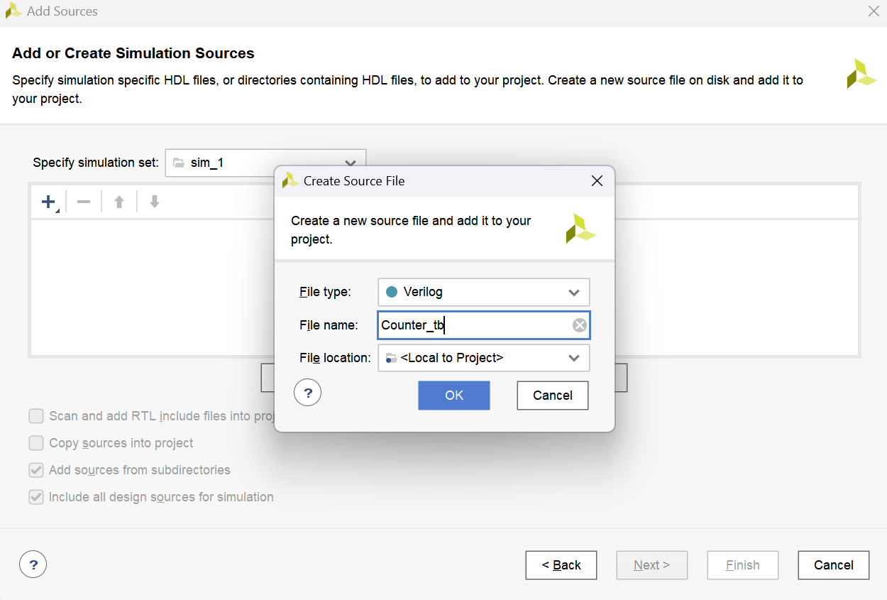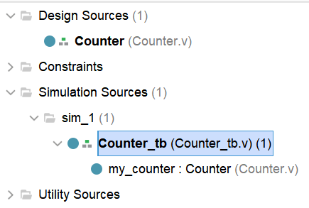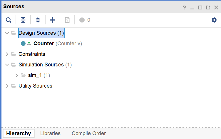 创建完成后,在 Sources 窗口中我们便可以看到创建好的 Counter.v