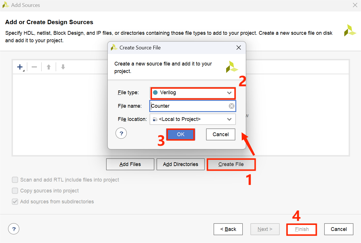 ,我们便可以创建一个全新的设计文件。这里可以设置文件类型与文件名,其中文件类型包括:Verilog、Verilog Header、SystemVerilog、VHDL 和 Memory File。在这里以及后续的实验中,我们都选择 Verilog 作为设计语言。文件名可以简单命名为 "Counter" 或其他你喜欢的名字。完成后单击 OK