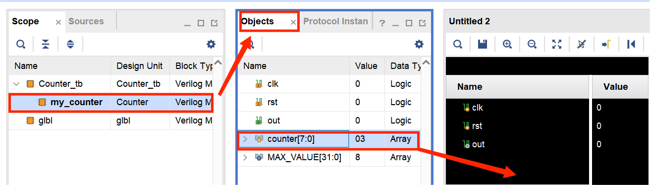 你可以点击左侧 Scope 选项卡中的模块名选中需要查看的模块,再在中间的 Objects 选项卡中选择模块内部信号,将其拖拽到波形图的 Name 列中,随后重新运行仿真以查看内部特定信号的波形。