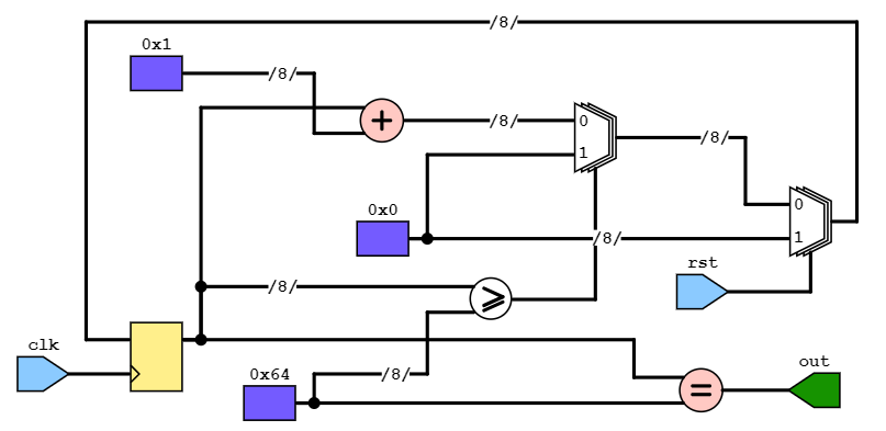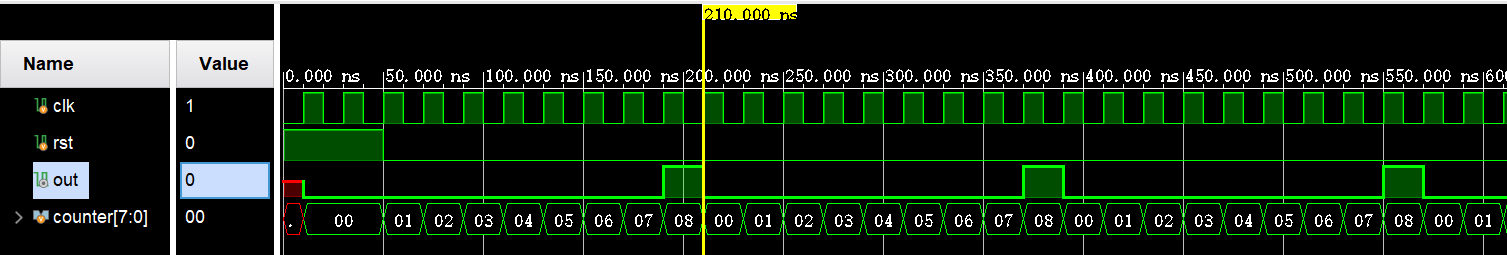 ,也就是当 counter 达到最大值的时候 out 输出 1。在下一个时钟周期,counter 将会被归零,out 也因此输出 0。