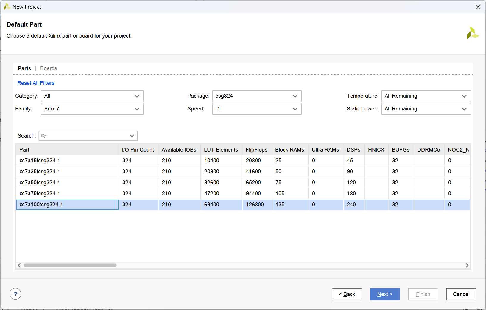(无需更改其他选项),直到遇到选择芯片型号(Default Part)的界面,按照下图所示的配置就可以找到我们使用的芯片型号:xc7a100tcsg324-1