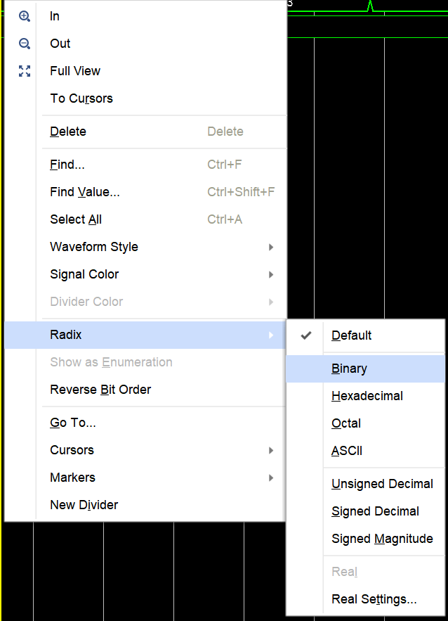 Vivado 的仿真支持对信号的自定义显示。你可以在仿真窗口中左键选中某一行信号,按下右键,在弹出的窗口中更改该信号的仿真样式。例如:下图展示了将显示的数据设定为二进制的方法。