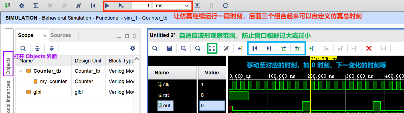 我们来简要介绍一下上图中的基本元素。左侧为模块与元素窗口,用于管理项目中不同层次模块内的信号;右侧为仿真波形窗口,用于显示各个时刻下不同信号的值。下图标注了一些常用的快捷按钮: