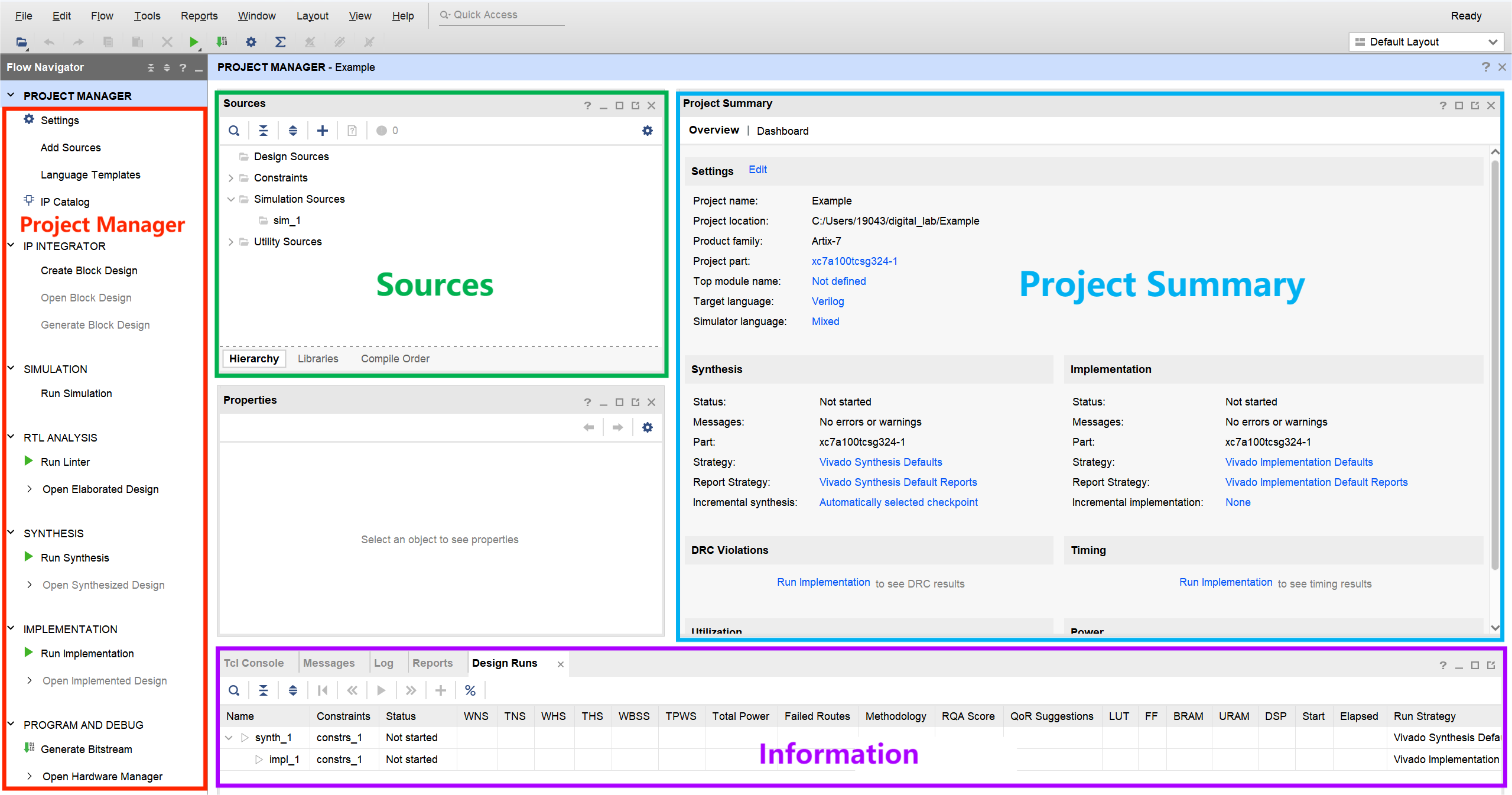 项目界面主要包含 4 大区域。其中 Project Manager 为工程管理窗口,可以完成添加代码、仿真、综合、烧写 FPGA 等一系列操作;Sources 窗口显示代码层级列表,分为设计文件、约束文件和仿真文件三组;Project Summary 窗口显示工程的各种基本信息;Information 窗口显示各种项目的信息参数。