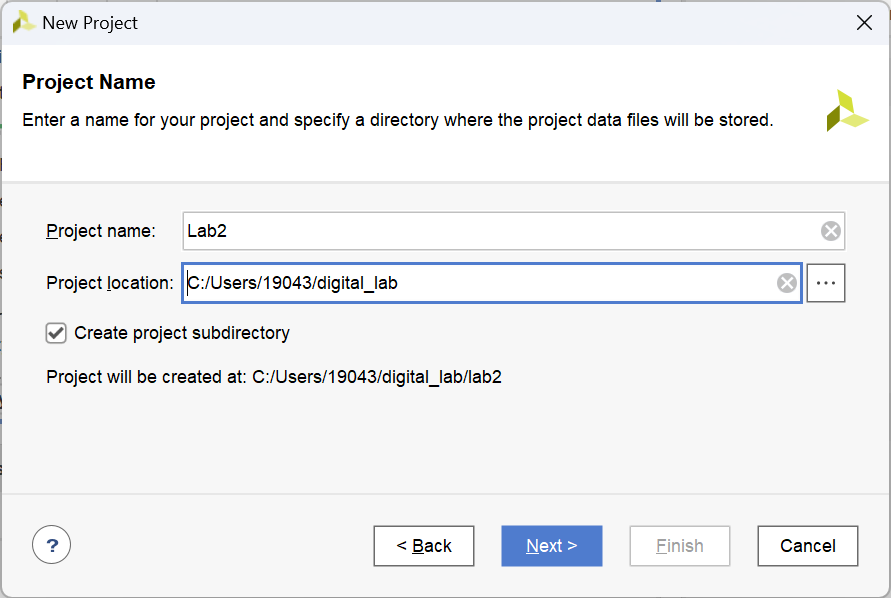 ,填写项目名称与项目路径。例如,本次实验可以将项目名称设定为 Lab2。