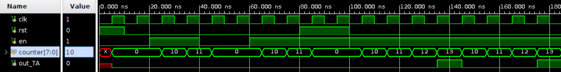 module q3_tb(); reg clk, rst, en; wire out_TA; initial begin clk = 0; rst = 1; en = 0; #10; rst = 0; #10; en = 1; #20; en = 0; #20; en = 1; #20; rst = 1; #20; rst = 0; #200; en = 0; end always #5 clk = ~clk; Counter #( .MIN_VALUE(8'd10), .MAX_VALUE(8'd13) ) counter ( .clk(clk), .rst(rst), .enable(en), .out(out_TA) ); endmodule