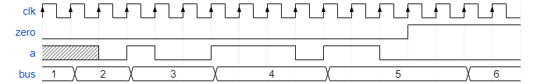 请编写仿真文件,生成下图所示的波形。时钟周期设定为 10ns,变量 bus 的位宽自行指定(图中存在偏差,实际上变量 bus 应在时钟上升沿变化)。图中的阴影部分代表电路状态不确定,你可以自行指定其状态。