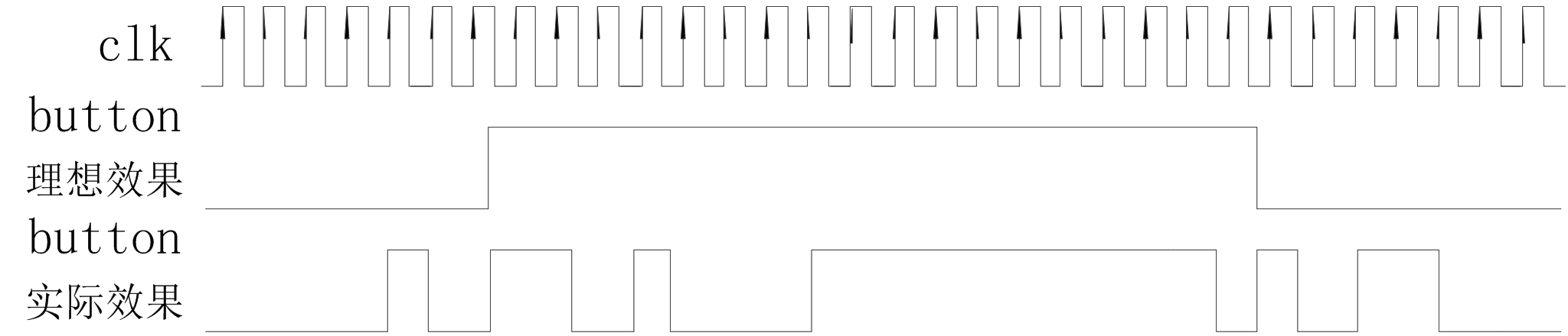 消除毛刺的关键在于区分有效的按钮输入和按钮按下或抬起瞬间的机械抖动。考虑到正常人类的反应速度,按钮按下再抬起的过程,最快也在毫秒以上量级,而抖动一般都在微秒甚至纳秒量级。因此我们可以通过信号电平持续时间的长短来判定是否为一次有效的按按钮操作。通过一个计数器对高电平持续时间进行计时,当按钮输入信号为 0 时,计数器清零,当输入信号为高电平时,计数器进行累加计数,计数达到阈值后则停止计数。