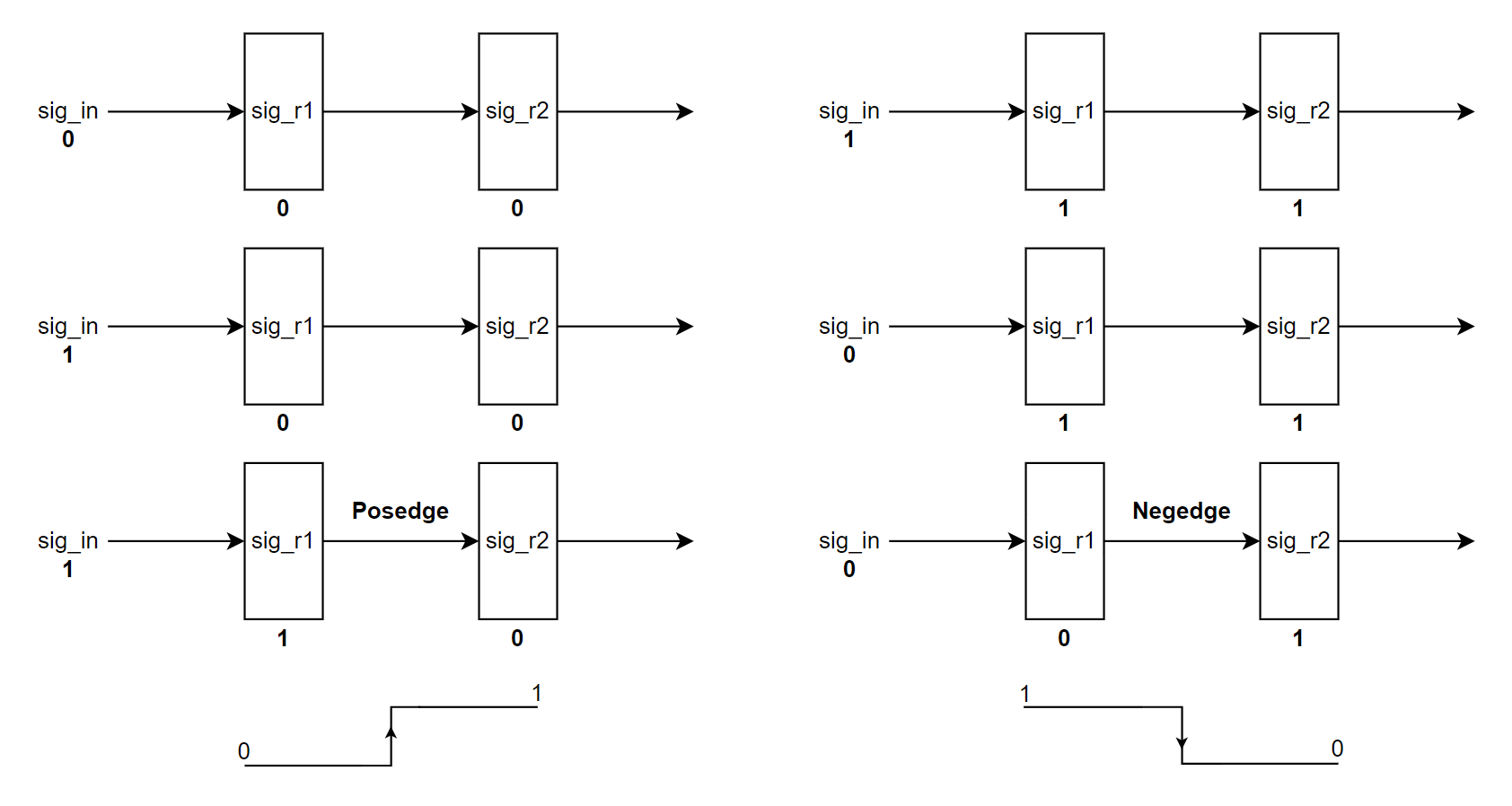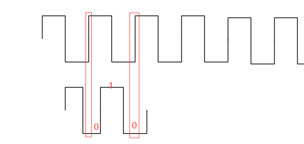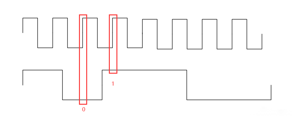 对于同步检测,我们通过比较输入信号在相邻两个时钟周期内的数值从而判断是否发生了电平变化。以下图为例,上方的是 clk 波形,下方的是输入信号波形。在某一个时钟上升沿时,输入信号为低电平(0);在下一个时钟上升沿时,输入信号为高电平(1)。此时我们就检测到了输入信号的上升沿变化,进而输出一个时钟周期的脉冲信号。
