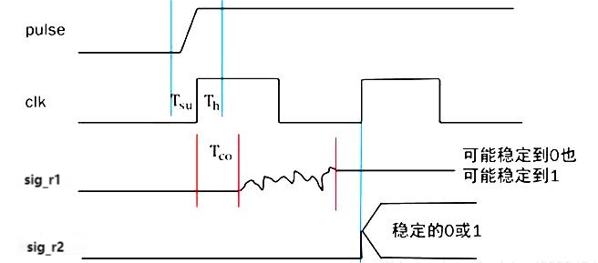 如下图所示,图中 Tco 为第一级寄存器 sig_r1 的状态建立时间(即 clock to output),一般情况下,亚稳态的决断时间(即从进入亚稳态到稳定下来的时间)不会超过一个时钟周期,因此在下一个 clk 上升沿到来之前,sig_r1 已经稳定下来(可能稳定到 0 也可能稳定到 1),这样第二级寄存器就会采集到一个稳定的状态,从而把亚稳态限制在第二级寄存器之前,保证了整个电路输出的稳定性。