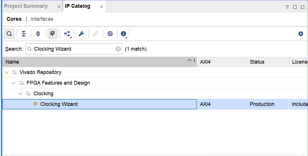 ,在搜索框中输入 "Clocking Wizard",并在下方窗口中双击 Clocking Wizard