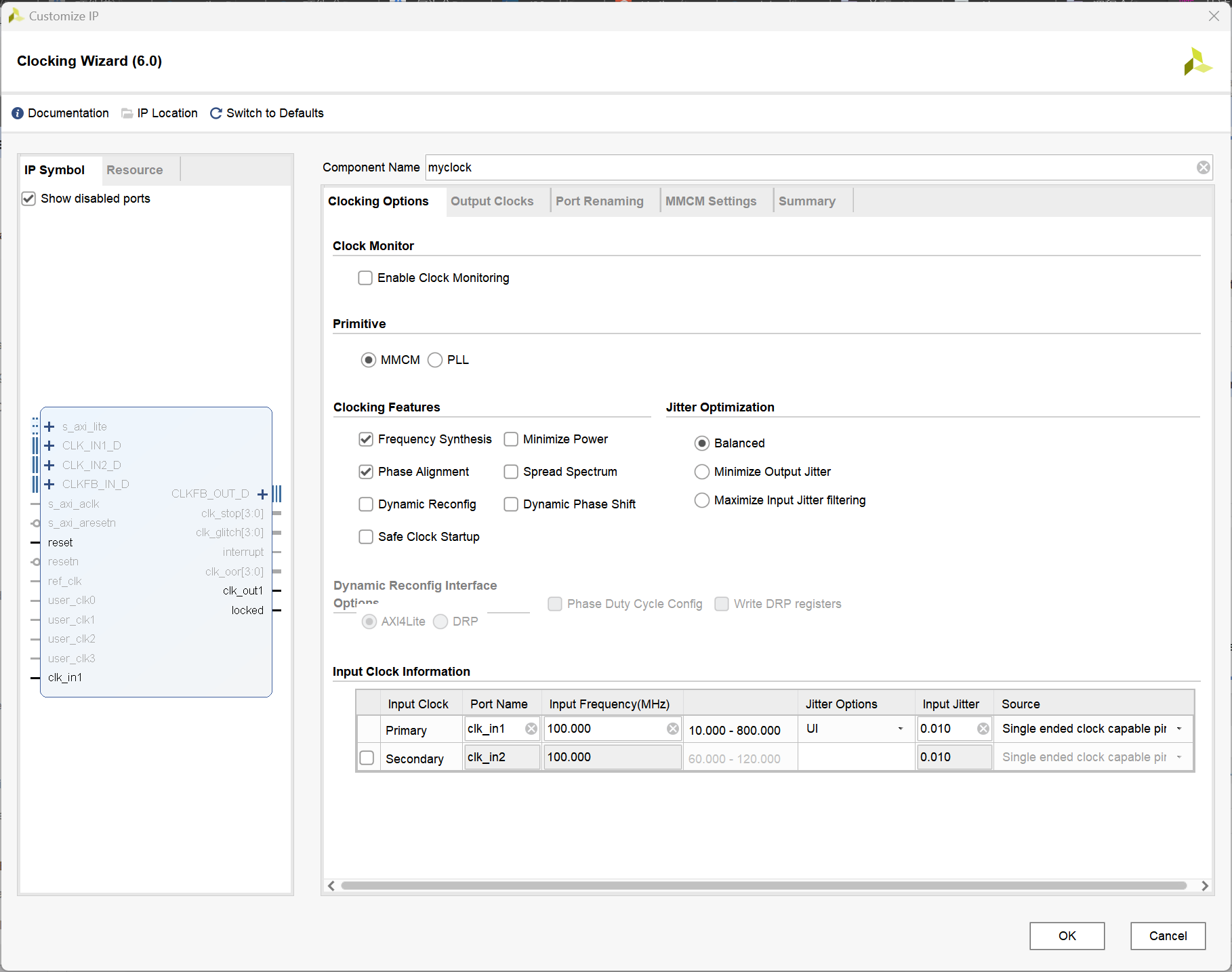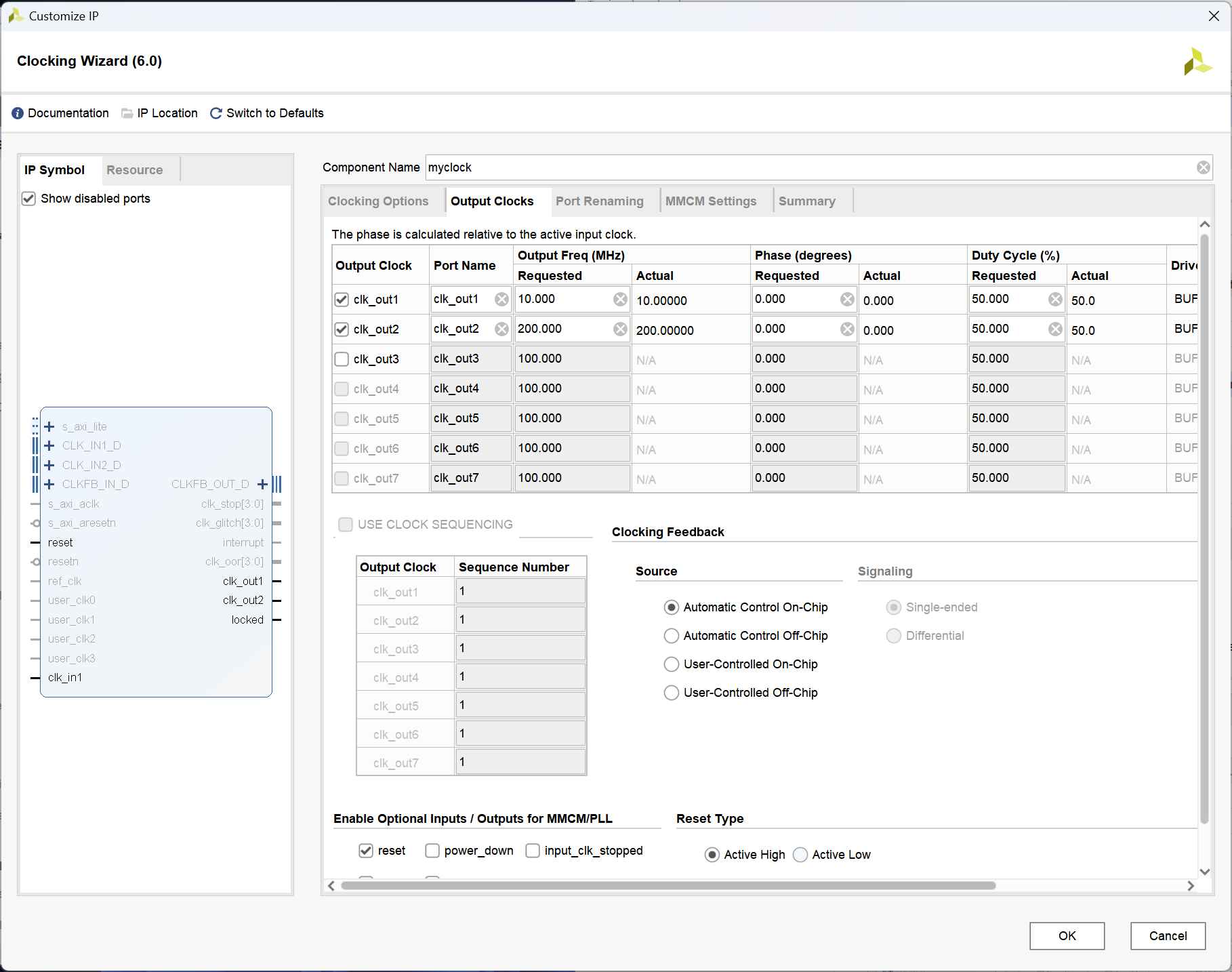 在打开的设置界面中,将输入时钟频率设置为 100MHz;输出时钟设定两个,分别为 10MHz 和 200MHz。将 IP 核的名字更改为 "myclock"。