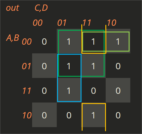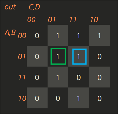 在这张图里,纵坐标为 AB、横坐标为 CD,对应的数值为 00、01、11、10。这样的排列保证了任何相邻的两个小方格在 ABCD 的坐标值上只有一位不同。例如,绿色框代表的输入为 ABCD=0101,蓝色框代表的输入为 ABCD=0111,仅有 C 一位不同。每一个小方格都与一种可能的输入对应。我们在每一个小方格中填入该输入对应的 out 值,也就得到了上图中的结果。
