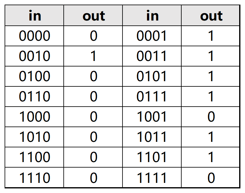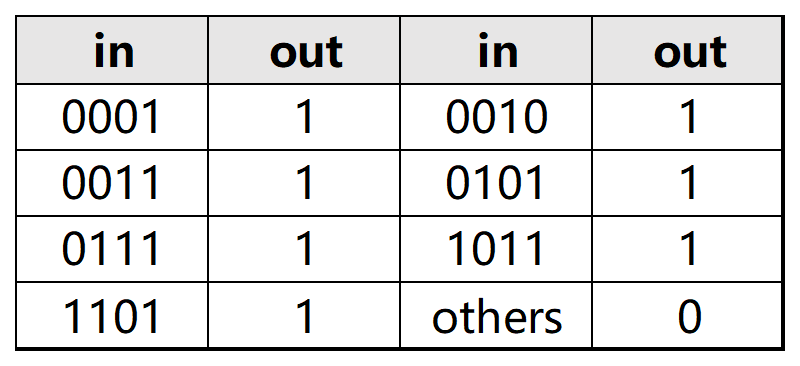 该同学委托我们对 \(p(n)\) 给出的结果进行正确性判断。简单起见,我们假定待测结果是 4bits 位宽的,以二进制编码格式输入,现在需要设计一个硬件模块,对于给定的输入 in