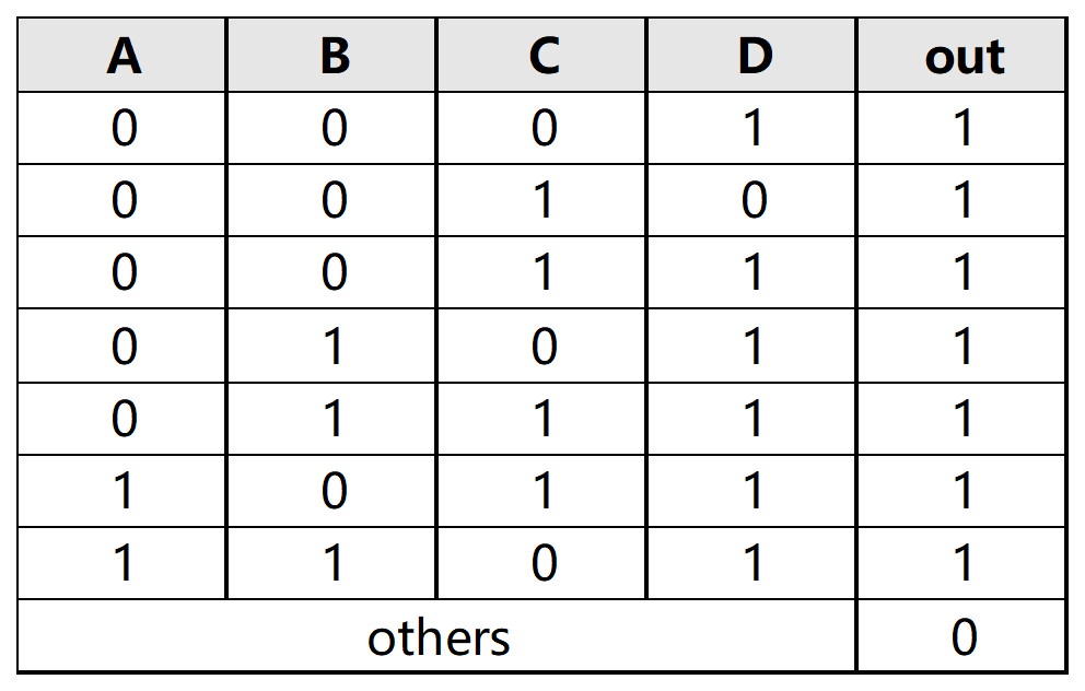 这个式子一共有七项,每一项对应着真值表中为 1 的一行。不难验证,任何 \(ABCD\) 的组合输入均可以得到 out 的正确结果。