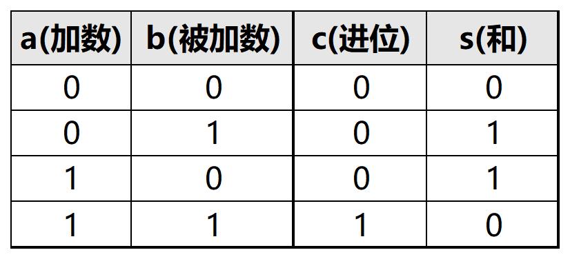 我们知道,二进制加法与十进制加法本质上是一致的,只是数字变成了二进制。这样的好处是每一位上可能的情况只有 \(2^2=4\) 种而不是 \(10^2=100\) 种。四种情况就是 1 bit 加法的四种可能:0+0、0+1、1+0、1+1。假定输入的两个 1bit 数为 a 和 b,由于结果可能是两位,我们引入两个 1bit 变量 s 和 c 表示结果,其中 s 表示低位,c 表示高位。据此,我们可以列出下面的真值表: