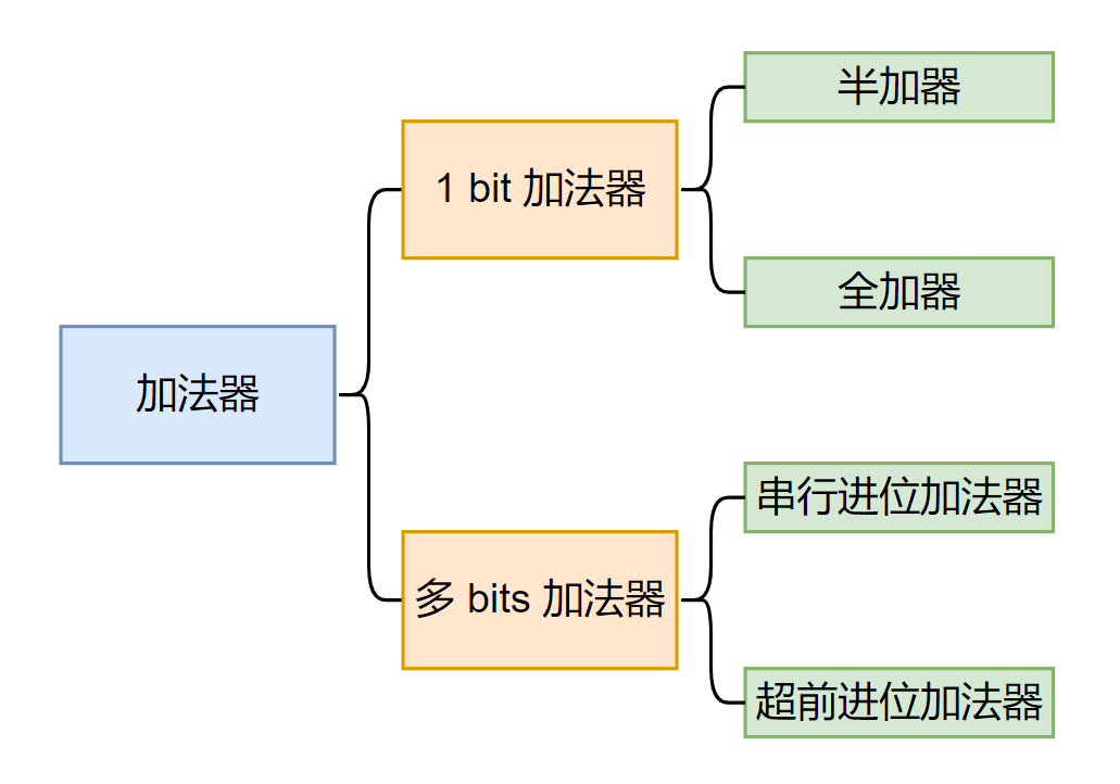 接下来的例子是关于加法器的。常用的加法器分类如下图所示。
