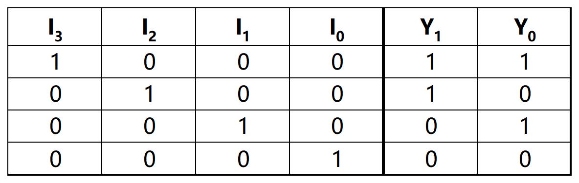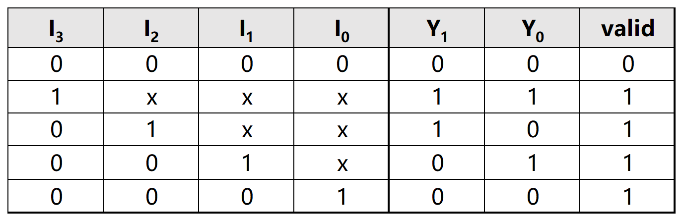我们把上面的场景形式化描述一下:输入信号有四位,分别记为 \(I_3\sim I_0\);为了区分四个不同的区域,我们需要 \(\log_24=2\) bits 的二进制编码,也就是说输出信号有两位,分别记为 \(Y_1\sim Y_0\)。我们可以列出下图所示的真值表: