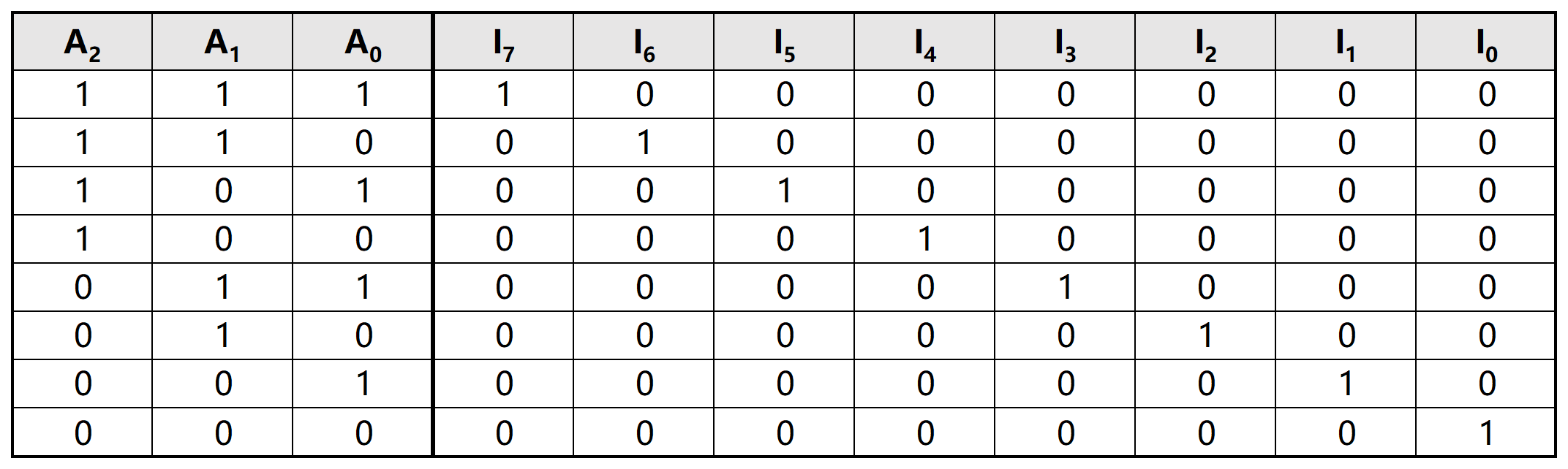简而言之,我们需要将输入的信号 \(A_2\sim A_0\) 翻译为对应的阿拉伯数字。同样地,我们使用 \(Y_7\sim Y_0\) 表示 8 种可能的阿拉伯数字。因此译码器的真值表如下图所示: