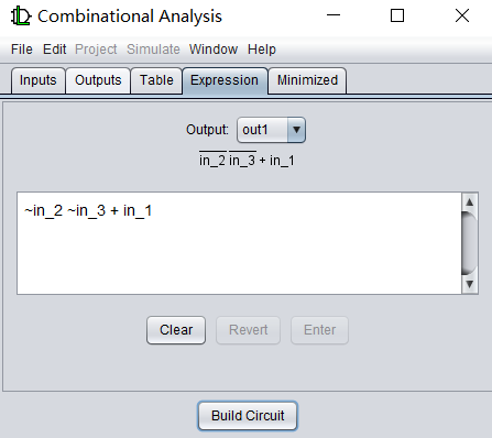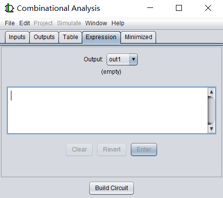 接下来,在菜单栏的 Project 选项卡中找到 Analyze Circuit 选项并选中。在弹出的窗口中选择 Expression 选项,按照相应的接口填入各输出项的逻辑表达式,最后点击 Build Circuit 生成电路: