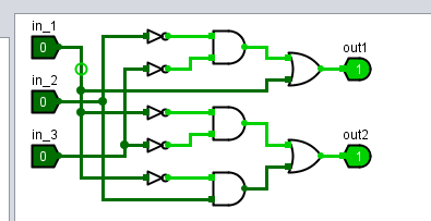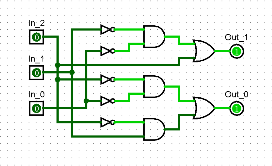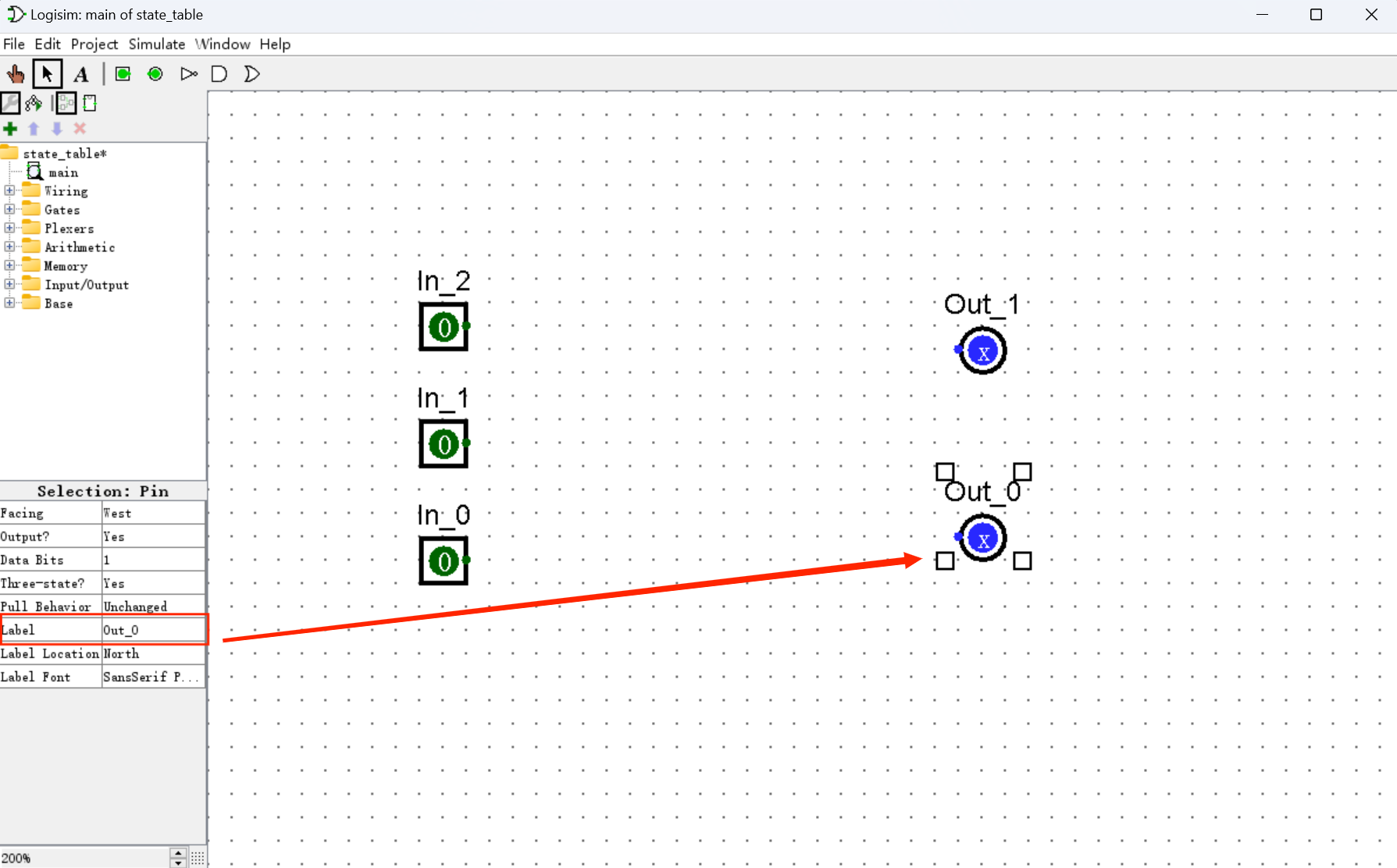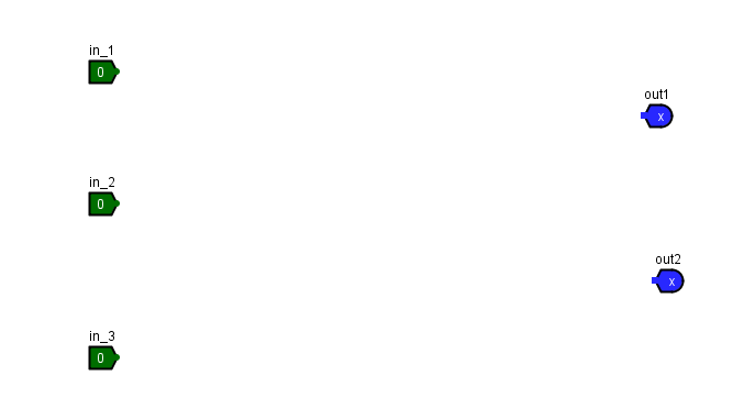 首先在 Logisim 中新建一个电路图(电路名称自拟),在电路图中放置输入引脚,有几个输入就放几个引脚,按同样的方式放置输出引脚。放置完毕后,给所有引脚标上标号,并按高低位顺序排列。对于表 1,我们的输入引脚为三个,输出引脚为两个。完成后的效果如下图所示。