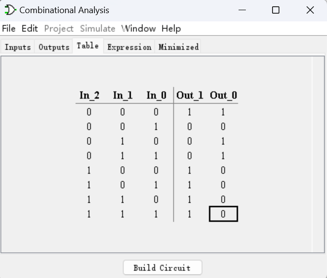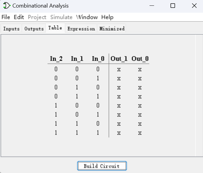 接下来,在菜单栏的 Project 选项卡中找到 Analyze Circuit 选项并选中。在弹出的窗口中选择 Table 选项,按照前面的真值表修改输出值(鼠标点击输出信号对应的叉号就可修改),最后点击 Build Circuit 便可生成电路(弹出的对话框都选择是)