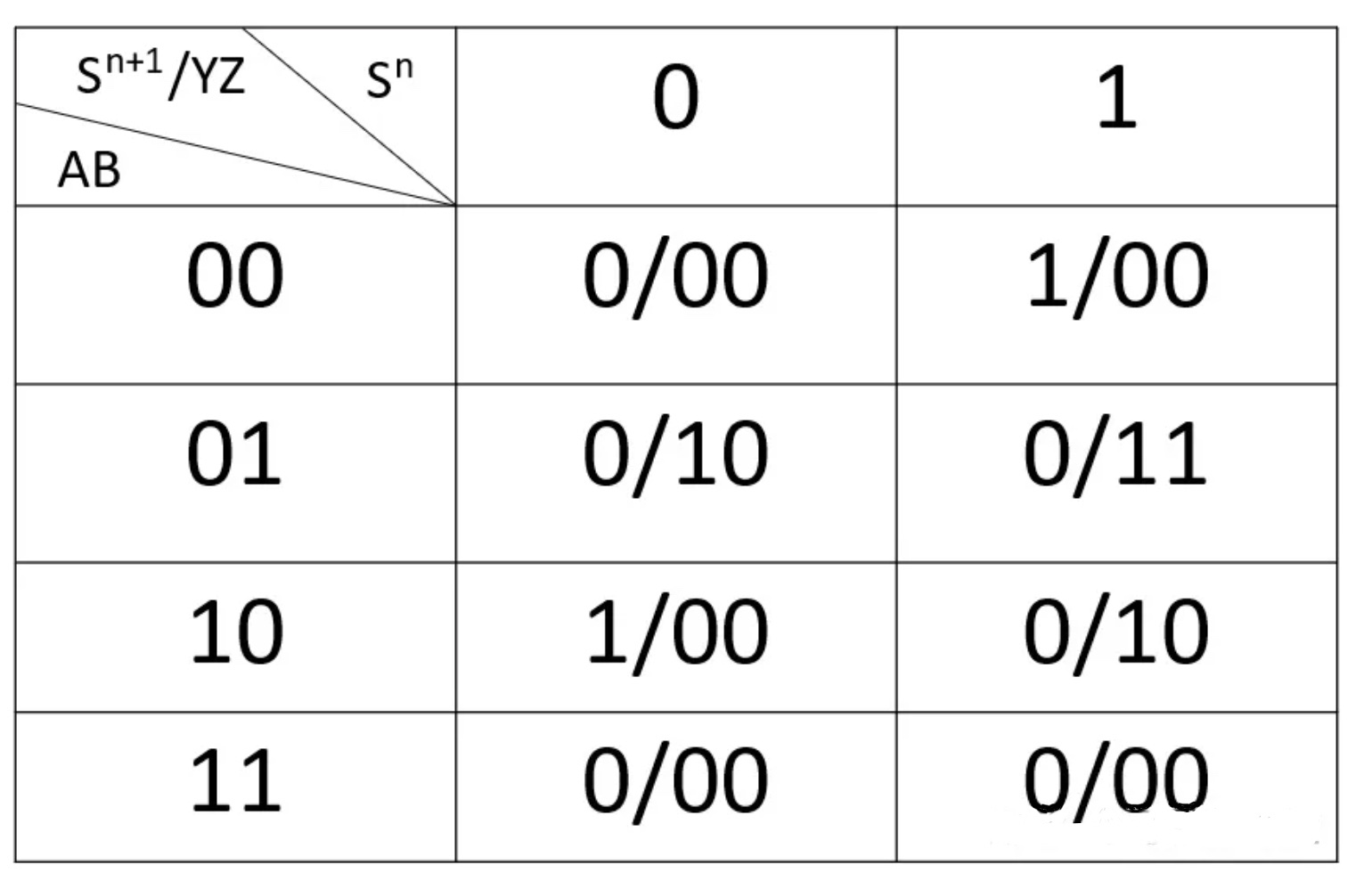 投入 10 分钱,则 AB=01,此时售卖机中已经达到 15 分钱,因此会弹出饮料,同时会找零,因此 YZ=11,完成交易后回到初始状态 S0,等待进行下一次交易。