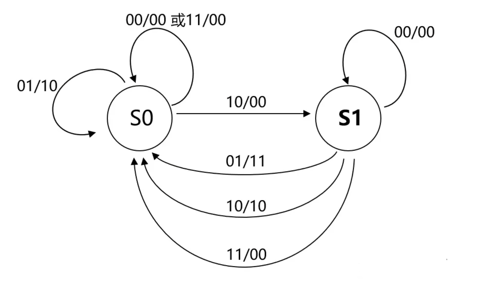 注意这里不存在其他的情况,比如已经投了 10 分钱,那已经足够完成本次交易,电路应该回归初始的 S0 状态,所以只会有 S0 和 S1 这两种状态。
