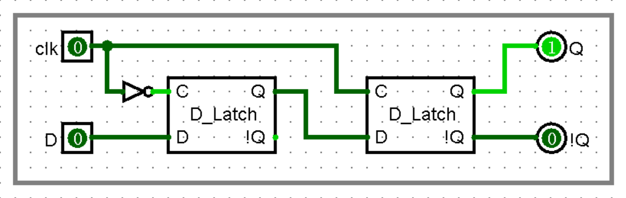 通过非门,两个 D 锁存器的时钟存在一个 180° 的相位差(也就是是相差半个时钟周期),从而实现,只在时钟上升沿的时候读取输入并输出,其他时候输入的变化不会传导到输出端,去除了输入可能存在的毛刺,得到了稳定的输出。
