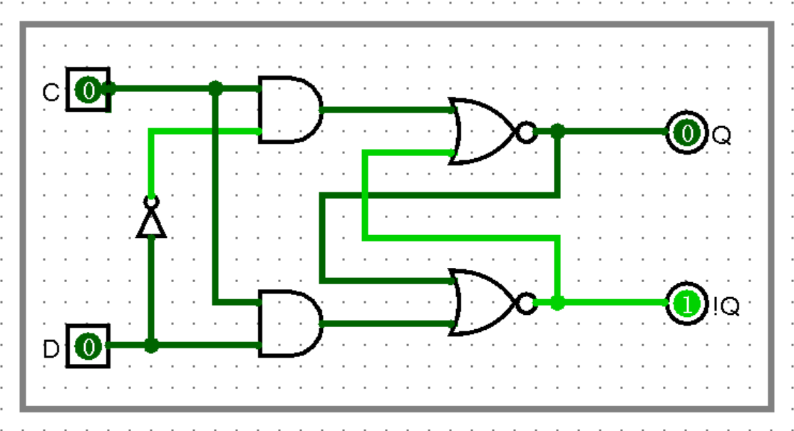 当 \(C=0\) 时,无论 D 端的输入是什么,与门的输出都为 0。此时相当于 RS 锁存器的输入为 \(S=0,R=0\),则 D 锁存器处于保持状态;当 \(C=1\) 时,我们便可以忽略与门。此时 RS 锁存器的输入为 \(S=D,R=\bar{D}\),显然有 \(S\cdot R=D\cdot\bar{D}\equiv0\)。因此 D 锁存器没有未定义状态,且内部存储的数值与 D 端的输入保持一致。